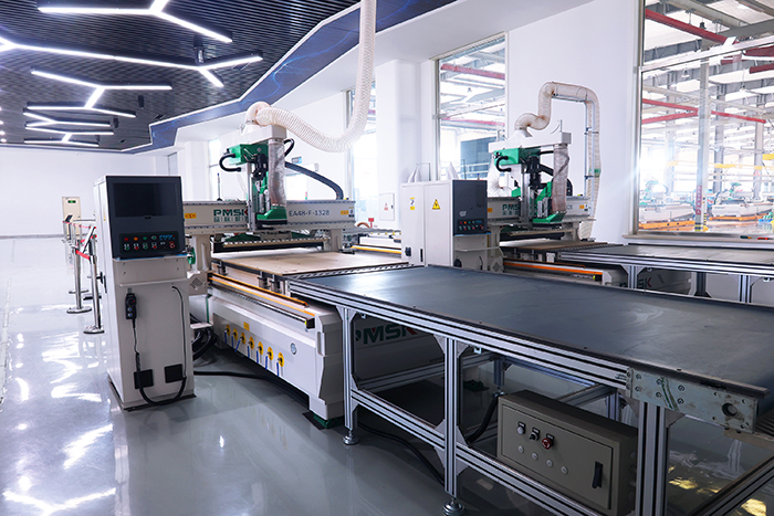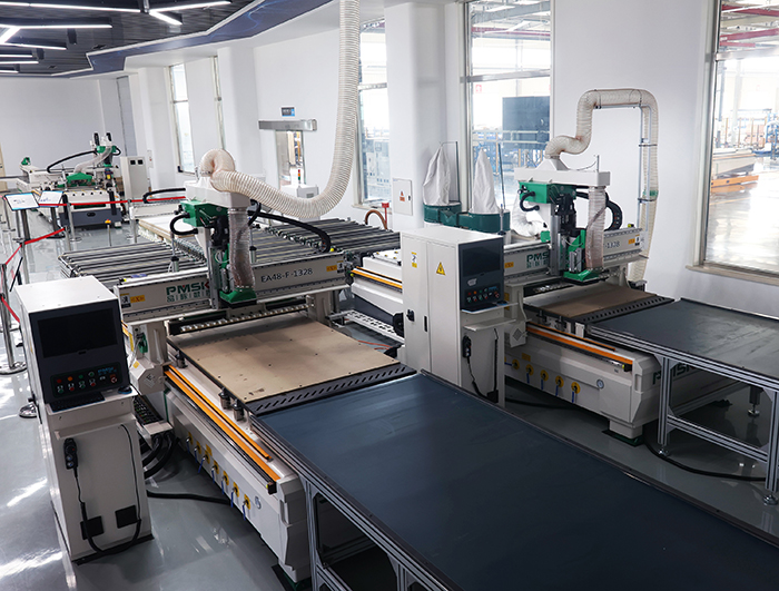 品脈數(shù)控一拖二智能開料單元是一套自動(dòng)化程度比較高的數(shù)控開料解決方案。開料單元由一臺(tái)高速自動(dòng)貼標(biāo)機(jī)、兩臺(tái)全自動(dòng)數(shù)控開料中心以及動(dòng)力滾筒線、中控系統(tǒng)組成。人工只需將板材放置在升降機(jī)上,由貼標(biāo)機(jī)自動(dòng)貼標(biāo),再由中控系統(tǒng)自動(dòng)分配至開料中心,完成板材切割工作。如選配機(jī)器人系統(tǒng),可由機(jī)器人完成碼垛,余料利用及廢料輸出等工作。