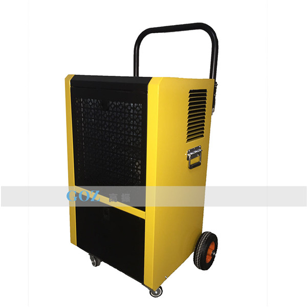 高振手推車除濕機通過風(fēng)機將潮濕空氣抽入機器內(nèi)部,通過壓縮機制冷將蒸發(fā)器降溫至露點以下,潮濕空氣經(jīng)過蒸發(fā)器在表面凝結(jié)成水,匯集至接水盤后,流入水箱中,干爽空氣經(jīng)冷凝器重新加熱由出風(fēng)口排出,這樣不斷循環(huán)將室內(nèi)濕度降低。
