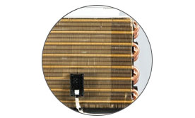 內(nèi)雙層全銅冷凝器,8根內(nèi)螺紋新型銅管,具備防污自清潔能力鈦金親水兩器100%純銅銅管。